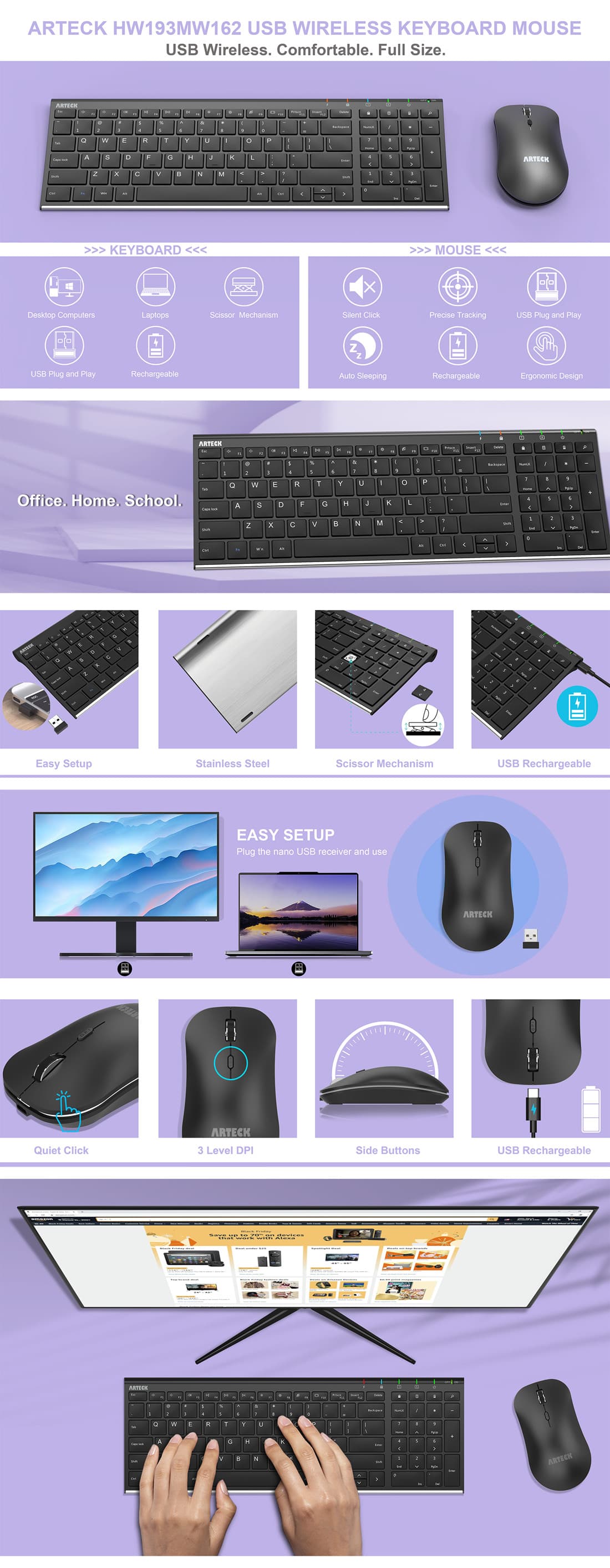 Stainless steel material gives heavy duty feeling and the low-profile keys offer quiet and comfortable typing. Ergonomic mouse reduce the stress with comfortable use. The mouse DPI switch allows you to change the speed of moving cursor.